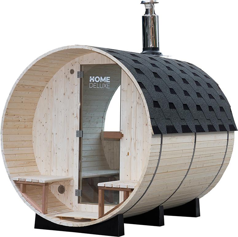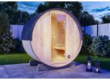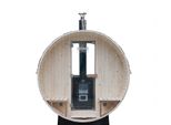 Mit einer Länge von 160 cm und einem Durchmesser von 204 cm bietet die Fasssauna ausreichend Platz für eine Person zum Liegen oder bis zu drei Personen zum Sitzen.