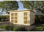 Die Doppelflügeltür mit einer Breite von 144 cm und einer Höhe von 172 cm gewährt Ihnen einen bequemen Zugang zu Ihrem neuen Gartenhaus. Das hochwertige Einsteckschloss sorgt zusätzlich für Sicherheit.